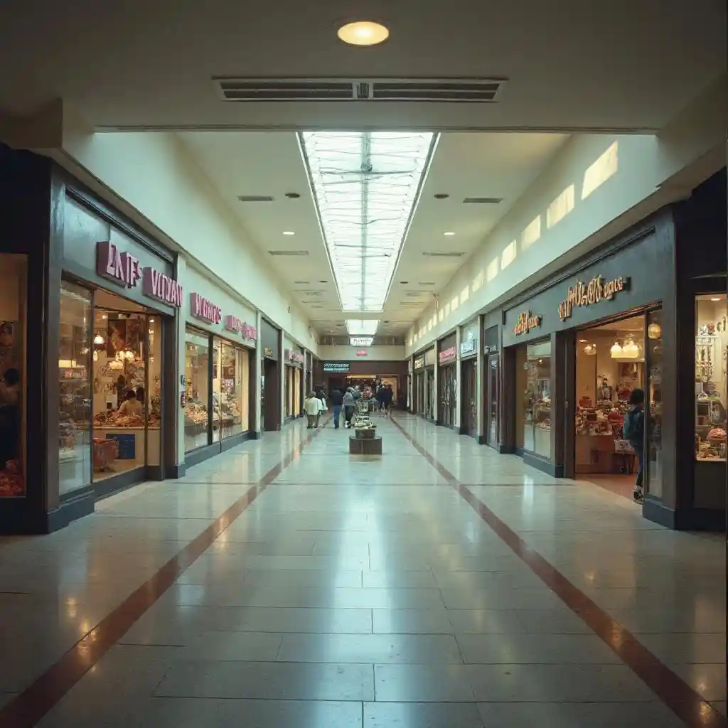 1985 closed shopping mall center court, liminal space, atmospheric