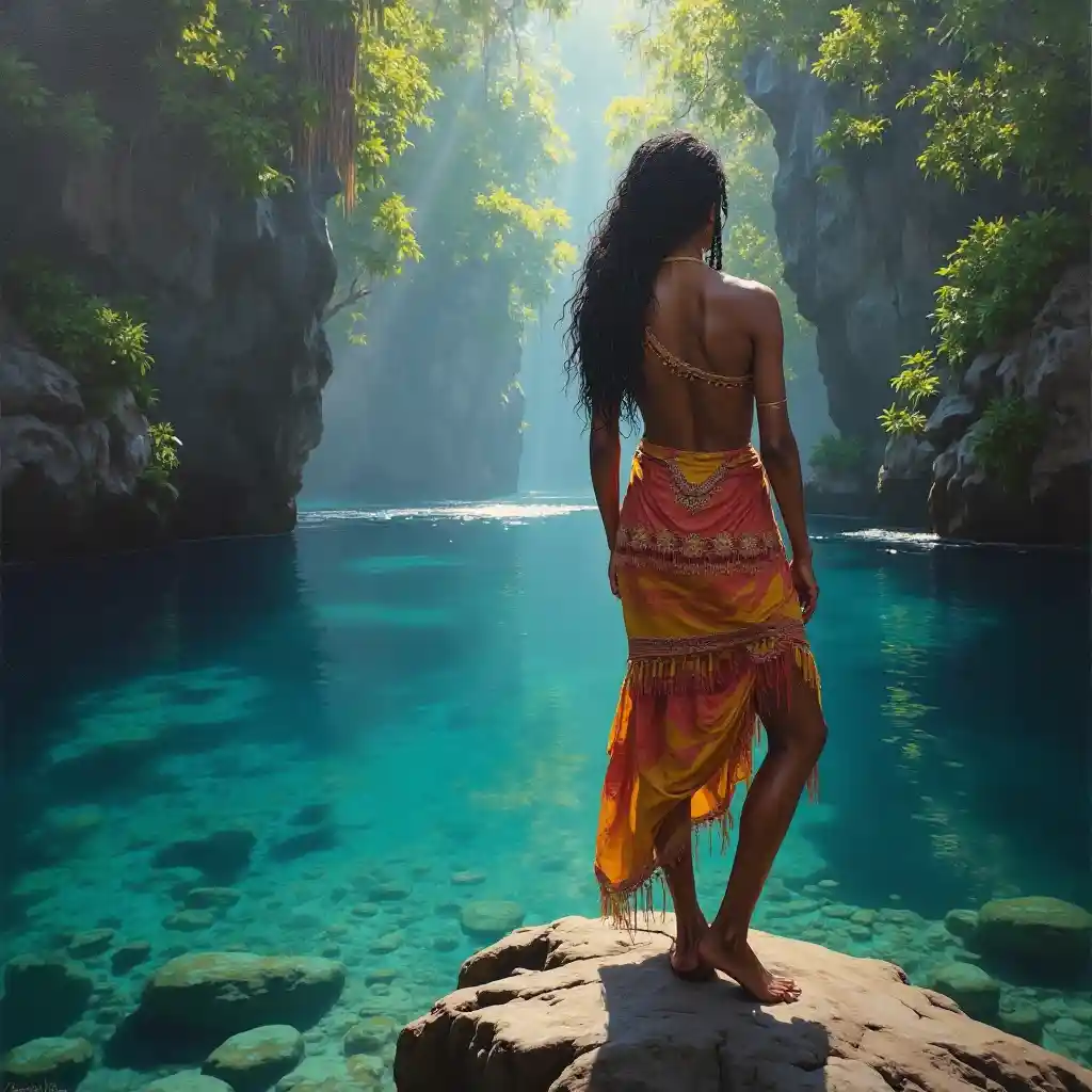 Beautiful Australian Aboriginal tribal woman (in front of beautiful gorge in Queensland rainforest with clear reflective aqua coloured water) that is blessed by the light of heaven. John Bauer Oil painting style.