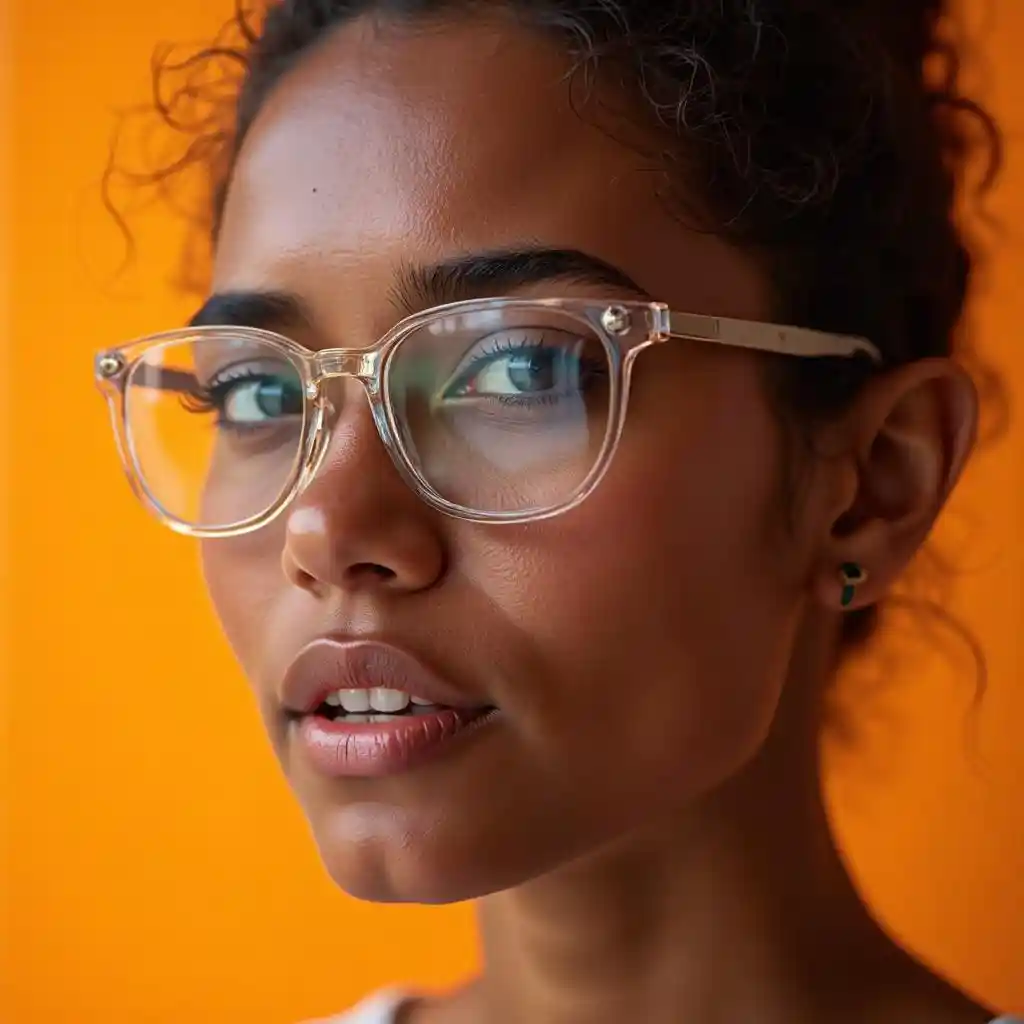 portrait of a person wearing acrylic glasses, detailed skin texture, orange background