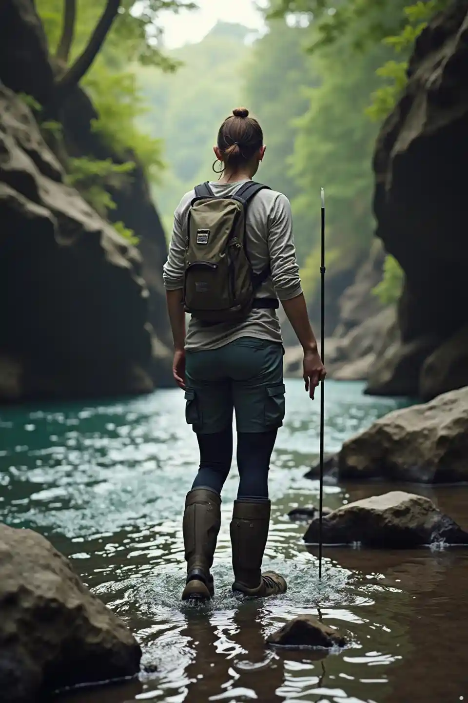 ColtenWoman holding a harpoons hunting fish in a ravine, Clothes for Easy Activities Detailed Description: Deep Valley in the Forest, Clear Water Stream, Activewear w