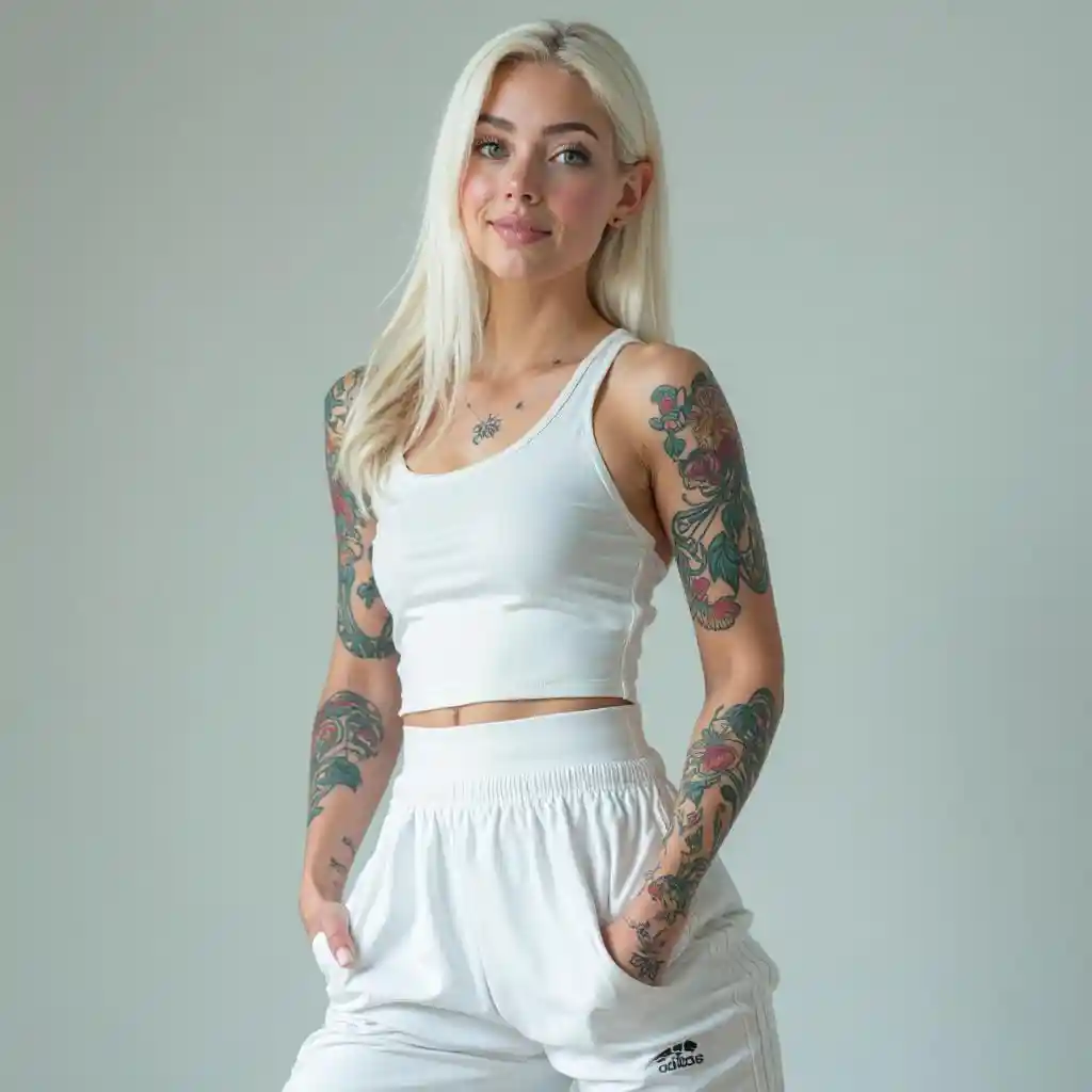 High quality, photo fullbody, Super realistic girl in a fancy white modern sports dress (adidas), make her beautiful, beautiful platinum hair, cute smile, fucsia carmin lips, cat eyes make-up, bold, cheerful look, Vibrant Colors, Extreme Beauty, tatoos