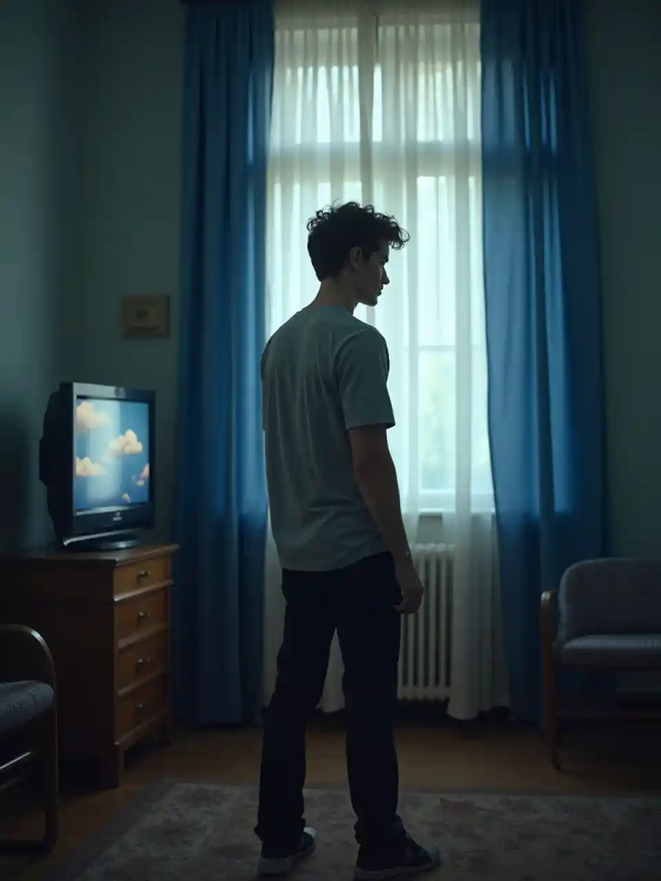 a young man standing in front of a tv in a room with blue curtains and a television screen on the wall, Adrian Zingg, paris school, full hd, a picture