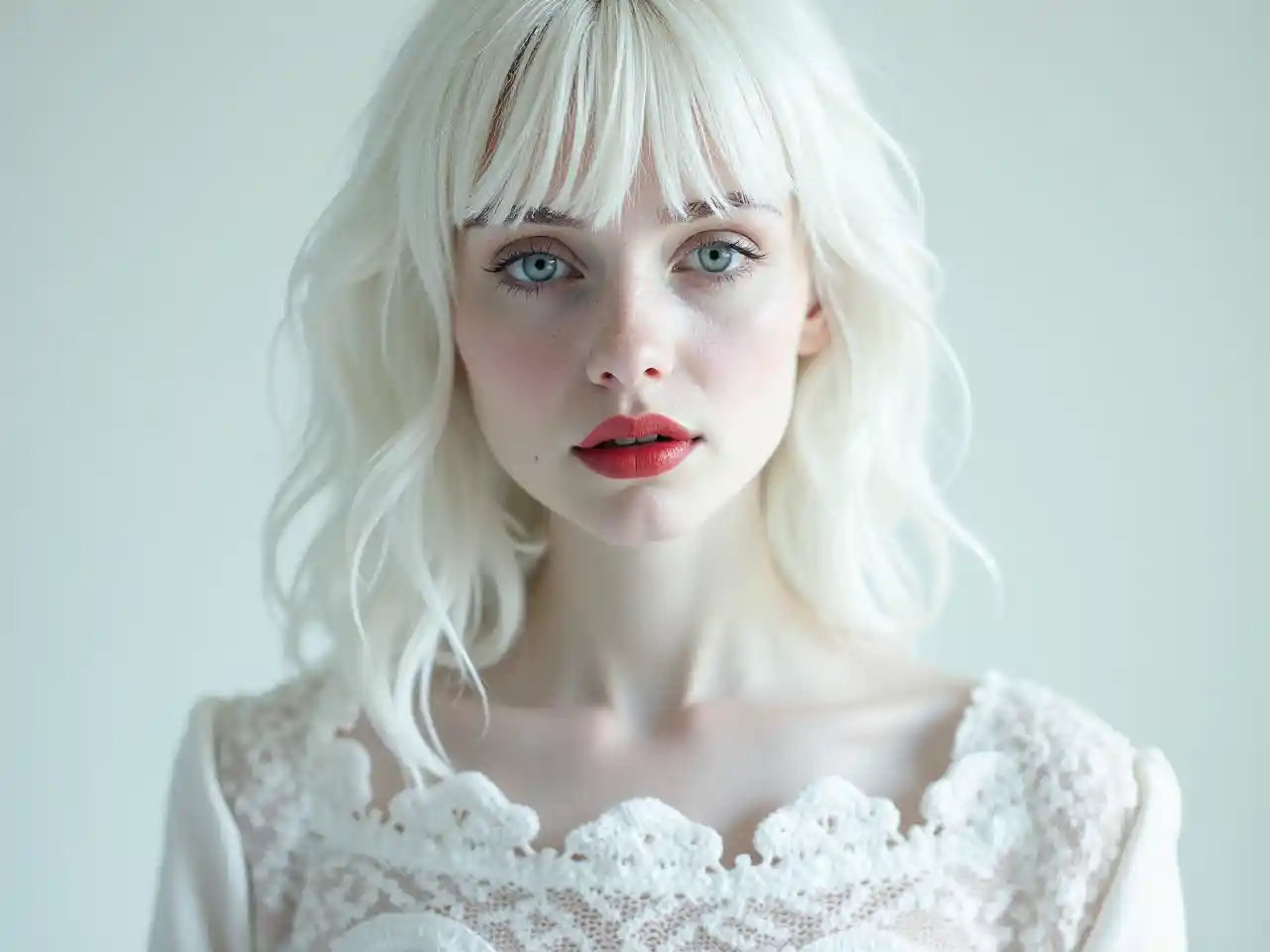 Coltonextremely realistic image of an albino woman, extremely white skin and hair, white lace clothes, (red lips), light grey eyes, ultra sharp focus, white background, studio photography by MSchiffer