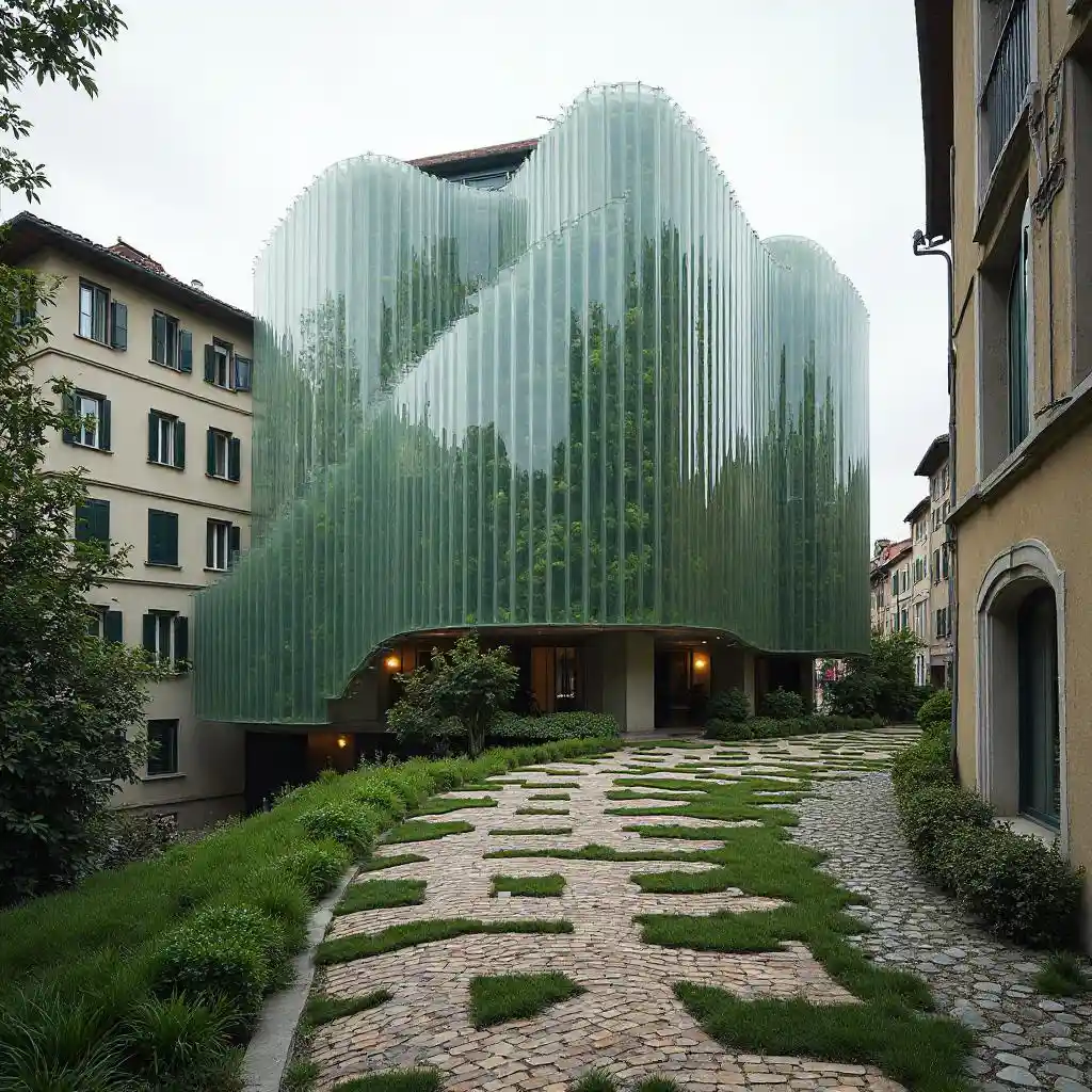 A low-rise hotel building nestled into a dense Italian residential quartier curved following a long, curvy street. The kinetic facade features a rotating shading system with slender, vertical glass panels filled with water and tiny, spherical algae, resembling thin aquariums. This creates a dynamic, green, underwater effect, offering innovative, sustainable insulation. The renovated, repurposed railing features mosaic paving in a randomized rectangular long grid pattern, where wooden planks alternate with patches of grass, creating a dynamic, chessboard-like effect.