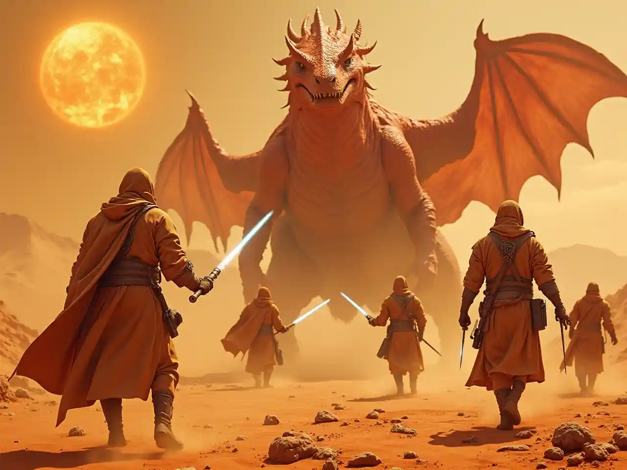 Cinematic photo of a (group of nomadic warriors), clad in (tan cloaks, tunics, trousers, and boots), throwing laser lances and spears at (fearsome crimson Sand Dragon) in an (arid ochre desert) on an alien planet. Fierce and desperate battle scene as the soldiers fight for survival against the giant beast. (Two suns) blaze overhead, casting dramatic shadows. The atmosphere encapsulates gritty realism, with a strong sense of urgency and intensity. (Vibrant, dynamic scene), 8K resolution, (ultra-detailed), capturing every expression and motion in high-quality clarity.