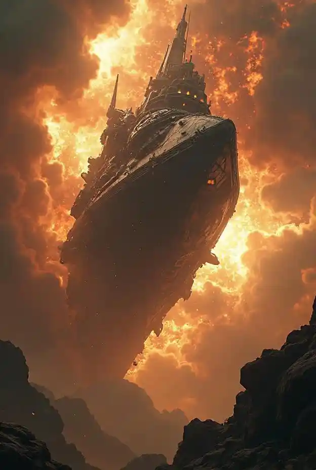 EastonA catastrophic scene where a massive, biomechanical alien dreadnought emerges from a glowing rift in spacetime. The ship looks like a fusion of machine and livi