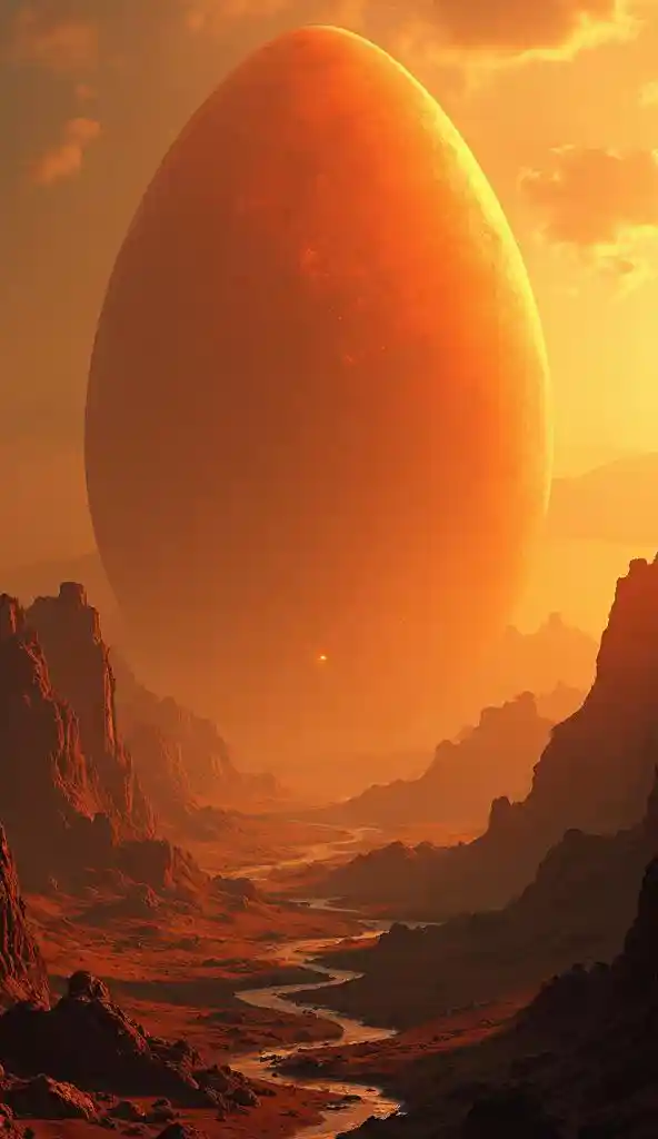 WyattOn a distant, enigmatic planet bathed in golden twilight, the colossal orange egg towers over an ancient, glowing landscape, its smooth surface pulsing with an
