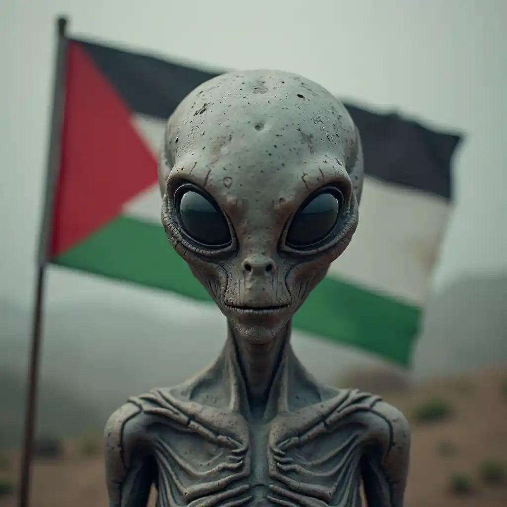 The Symbolism of a Palestinian Flag Behind an Alien Figure