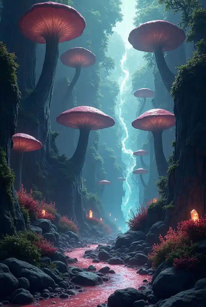 GrimAn exuberant alien planet, with forests of living crystals, giant fungi breathing light, rivers that shine with bioluminescence, and creatures that integrate pe