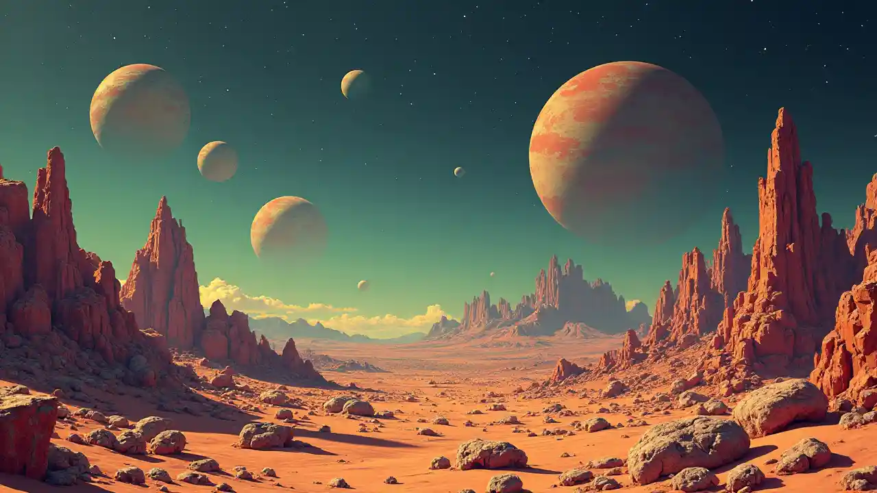 ruslanasurreal looking alien planet from space, retro star trek, Moebius