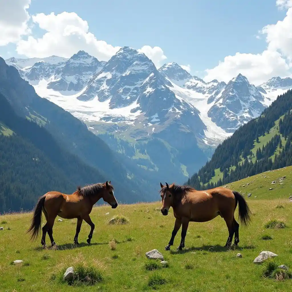 Grand alpine meadows, with wild horses grazing beneath snow-capped peaks.