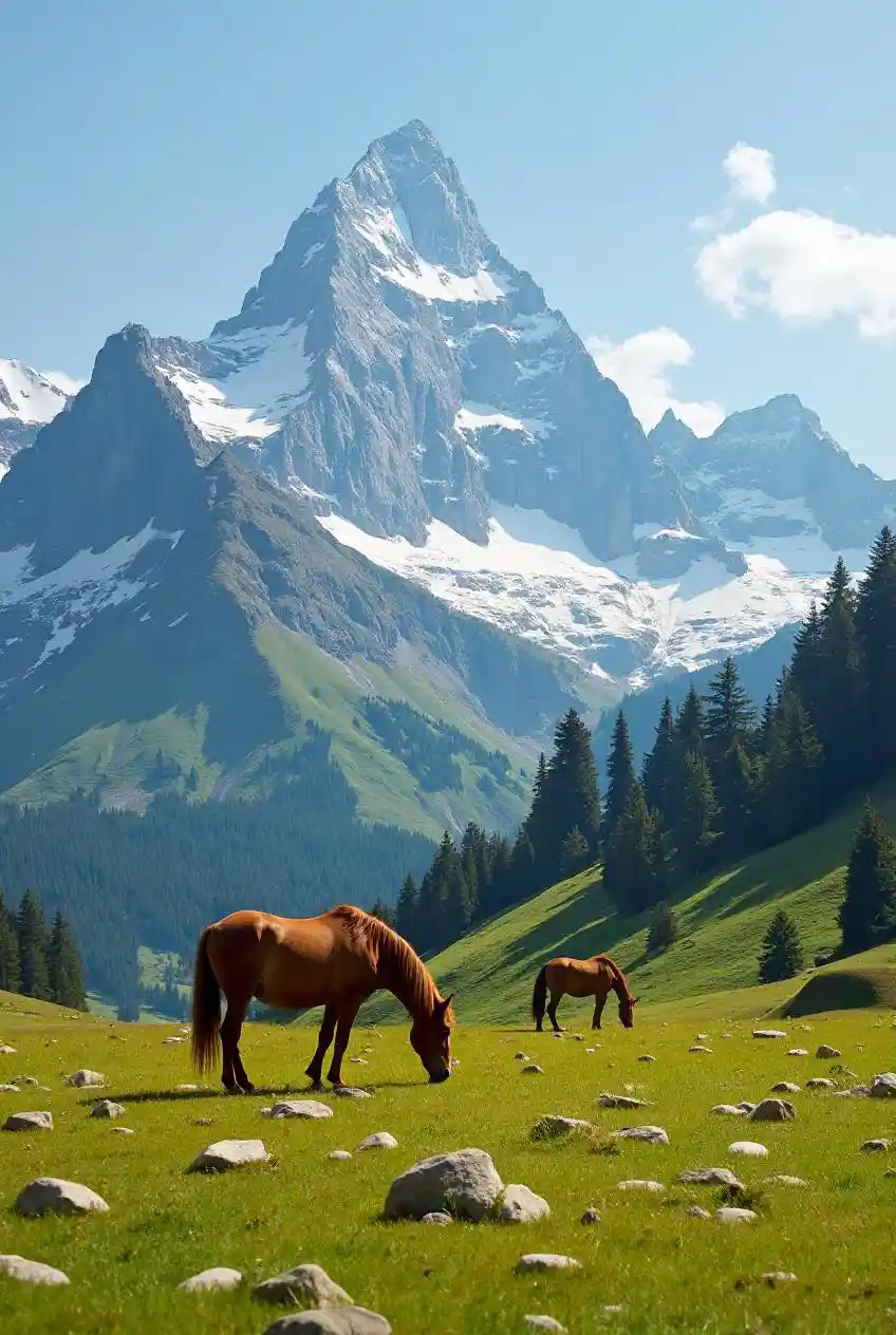 Grand alpine meadows, with wild horses grazing beneath snow-capped peaks.