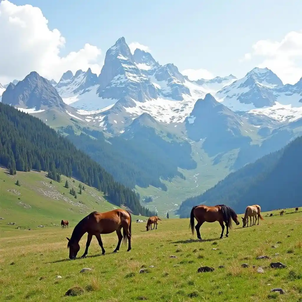 Grand alpine meadows, with wild horses grazing beneath snow-capped peaks.