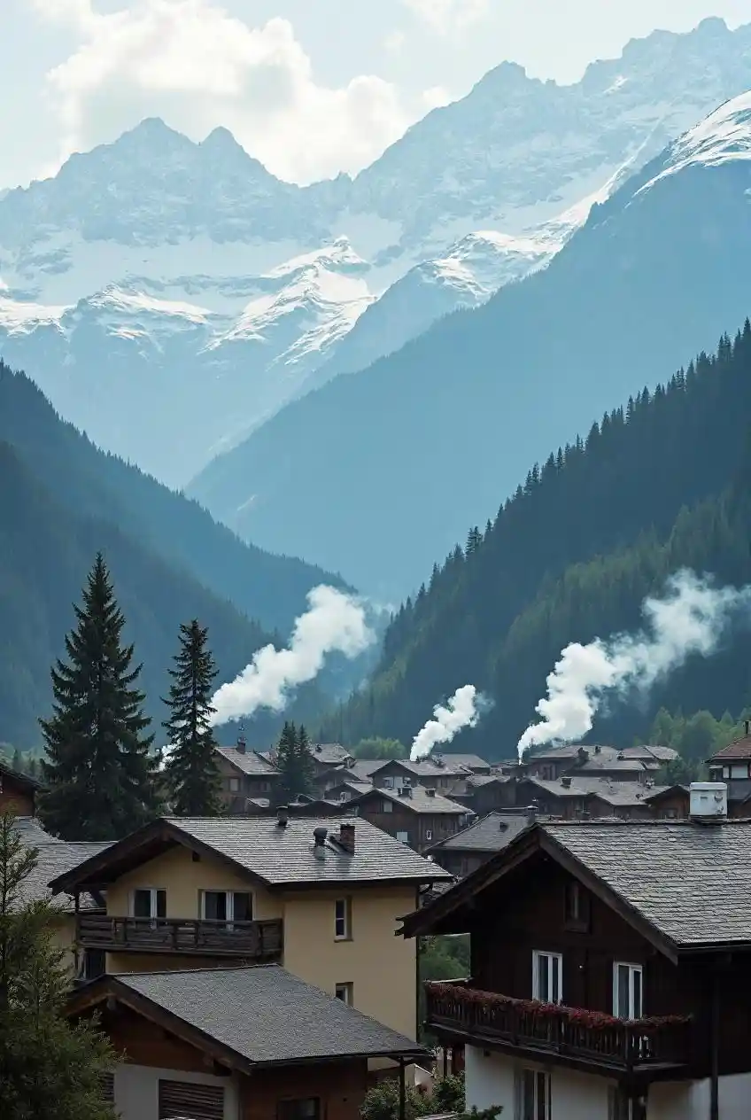 Swiss chalet village, smoke rising from chimneys, framed by towering Alps.