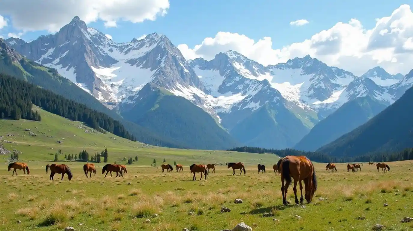 Grand alpine meadows, with wild horses grazing beneath snow-capped peaks.
