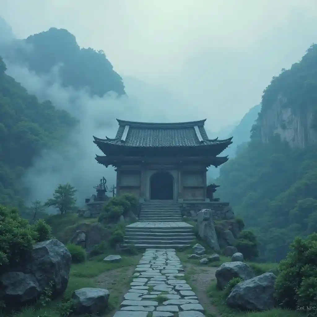LunaAn old shrine amidst foggy mountains, exuding a mystical aura found in feudal-era anime.