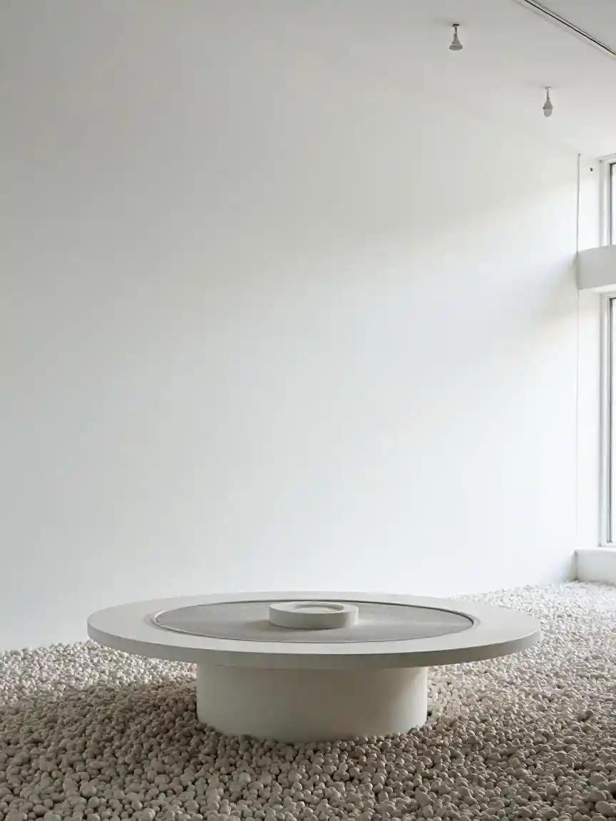 A white wall with pebbles on the floor, an empty room with light coming in from large windows, a circular table with a mesh screen and a white paper box at its center, minimalist architecture in the style of Tadao Ando, natural lighting, architectural photography.