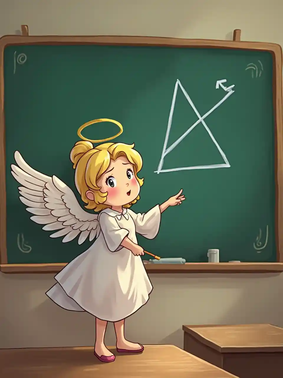 Image of an angel, teaching about Angles, triangle, on a blackboard, classroom, funny, cute chibi, 8K high quality, masterpiece