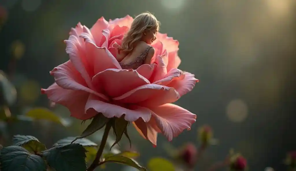 photo 8K Ultra HD, Masterpiece, best quality, extremely Realistic, full body view. huge plum rose bud. pretty woman angel is sitting on rose bud. [[[[deformed l