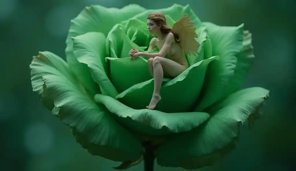 photo 8K Ultra HD, Masterpiece, best quality, extremely Realistic, full body view. huge emerald rose bud. pretty woman angel is sitting on rose bud. [[[[deforme