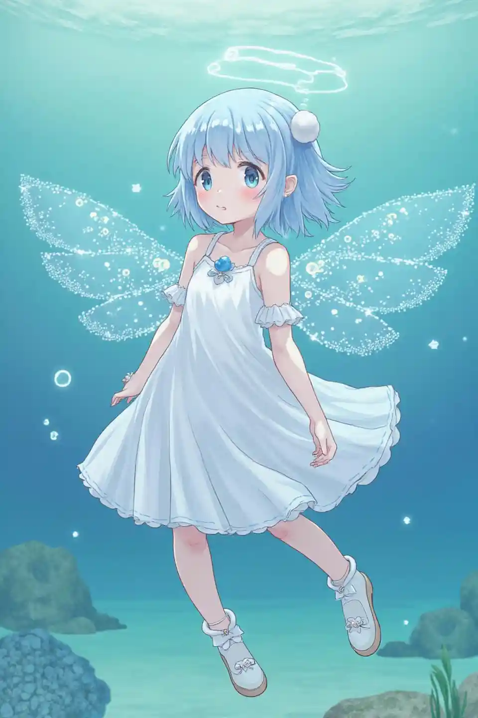 Skylarone girl、 under the water、masterpiece、Top Quality、best image quality、cute little、Air bubbles、Underwater Temple 、Angel T、light blue hair、light blue hair、Flutteri