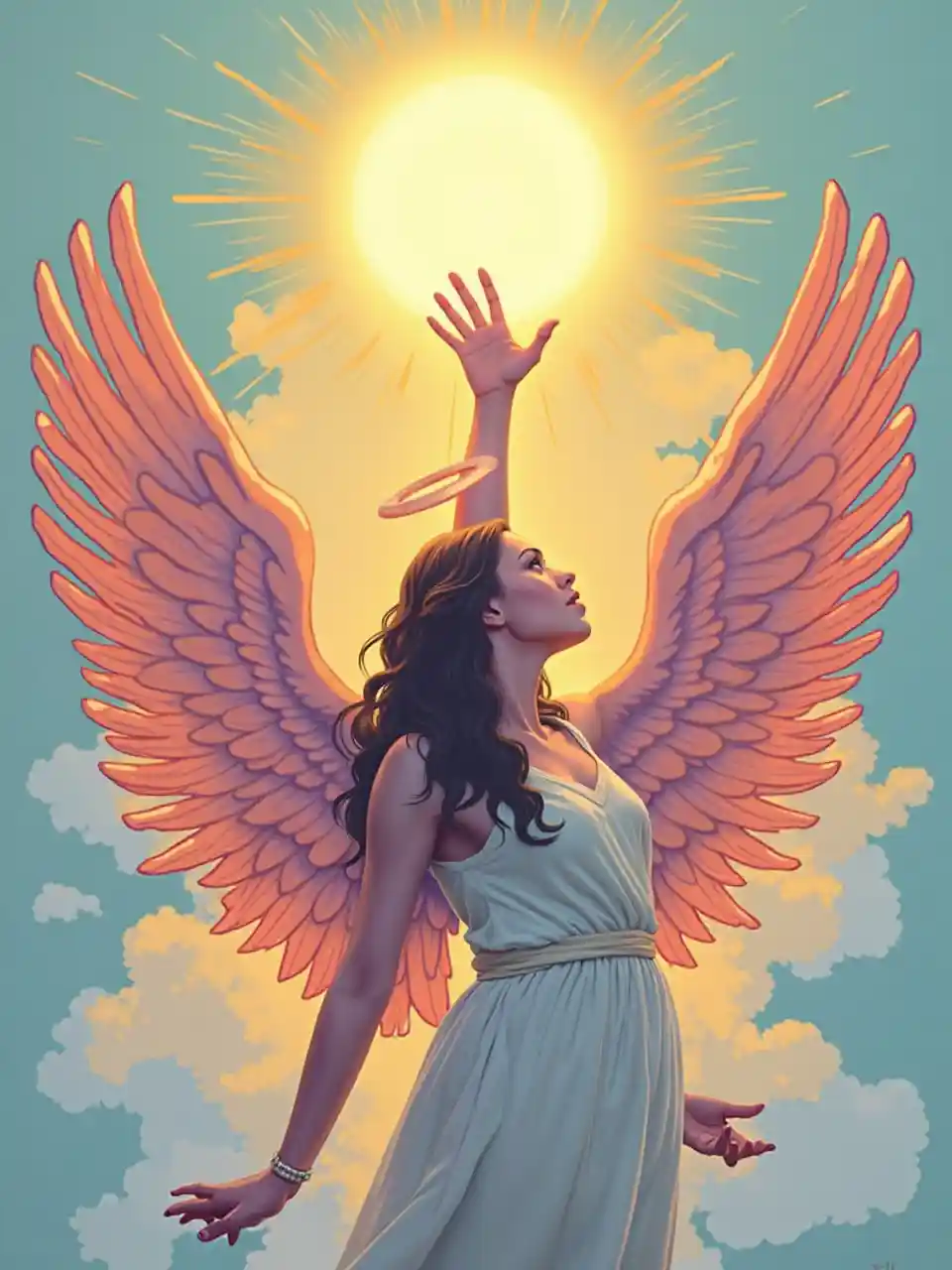 woman with angel wings, halo, reaching up towards an orb of light, bold, pop art, pastel colors