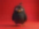 angry birds black bird on red background, standing centered in 3D style, rendered using beautiful Disney animation, Pixar style, Disney style, 3D style