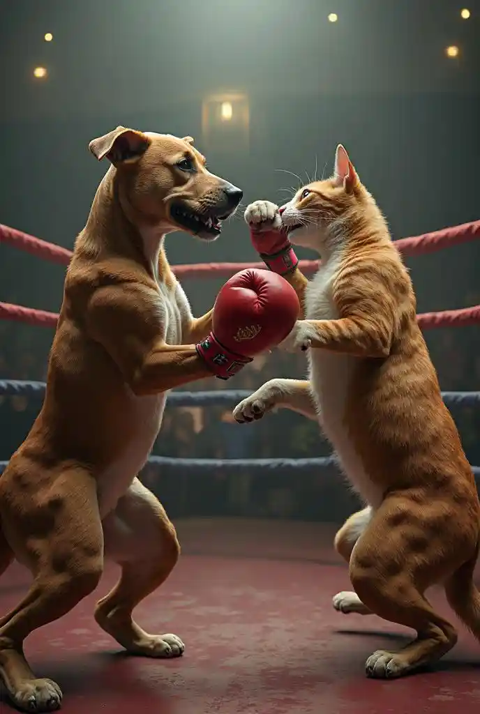Scott(Best quality, masterpiece, super detailed, high resolution), In a boxing ring, ((a dog and cat fight)), boxing gloves, ((fighting)), ((dog and cat punching ea