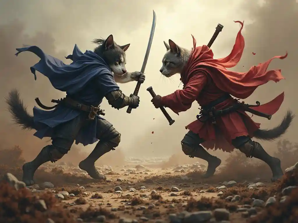 Rileytotal war, (humanoid dogs versus humanoid cats), Ninja cats, Samurai dogs, Total disaster, calamity , masterpiece