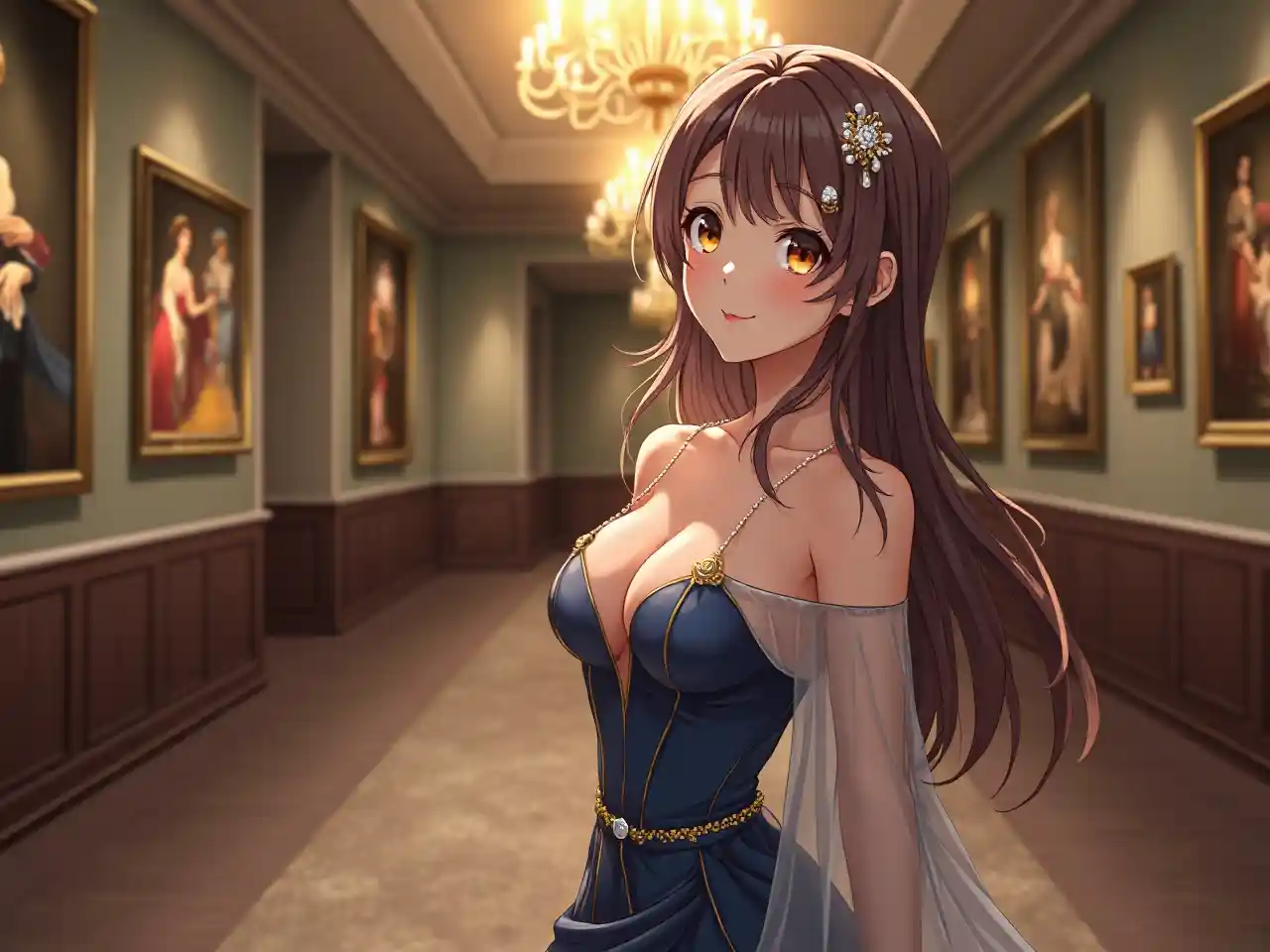 Horizontal large-scale image of an Ultra HD anime girl, breathtakingly beautiful and elegant, illuminated by a chandelier’s light, standing in an indoor art gallery with classical paintings, wearing a luxurious evening gown with a plunging neckline and sheer sleeves, her long hair adorned with a pearl hairpin and a gentle smile, wide sparkling eyes, glowing skin, deep gold and blue color palette, refined features, flawless makeup, sophisticated and artistic vibes, warm lighting with a soft glow, emphasizing her graceful, well-defined chest with a subtle cleavage, and long, toned legs with a poised posture, exuding charm and elegance.