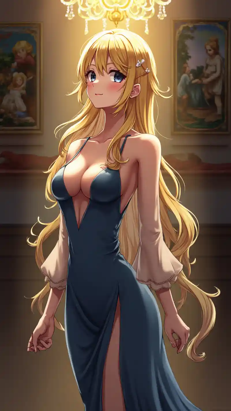 Vertical large-scale image of an Ultra HD anime girl, radiantly beautiful and sensual, illuminated by a chandelier’s light, standing in an indoor art gallery with classical paintings, wearing a luxurious evening gown with a plunging neckline and sheer sleeves, her long hair adorned with a pearl hairpin and a gentle smile, big shimmering eyes, glowing skin, deep gold and blue color palette, elegant features, flawless makeup, sophisticated and artistic vibes, warm lighting with a soft glow, emphasizing her alluring, well-defined chest with a subtle cleavage, and long, toned legs with a poised posture, exuding charm and elegance.