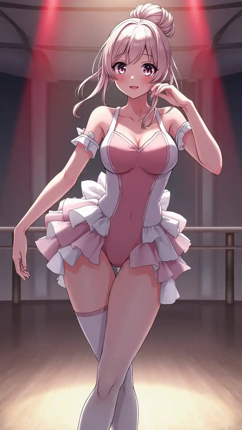 Vertical large-scale image of an Ultra HD anime girl, strikingly gorgeous and graceful, illuminated by stage lights, standing on an indoor dance studio with mirrors, wearing a ballet-inspired outfit with a deep neckline and thigh-high stockings, her long hair tied in a bun with a ribbon and a confident smile, wide sparkling eyes, glowing skin, soft pink and white color palette, sharp features, perfect makeup, graceful and artistic vibes, dynamic lighting with a soft glow, showcasing her alluring, well-defined chest with a subtle cleavage, and long, toned legs with a dynamic pose, radiating beauty and grace.