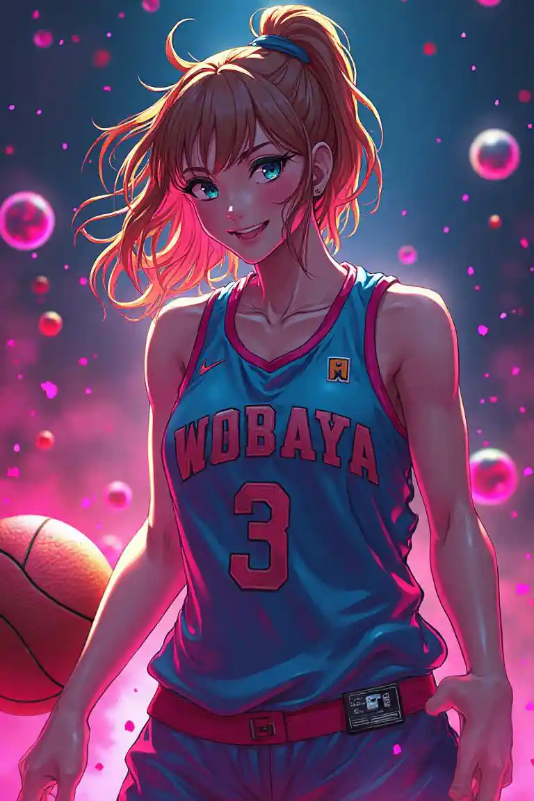 Anime-style, female basketball player, basketball player uniform, Dynamic poses, neon sweat effects