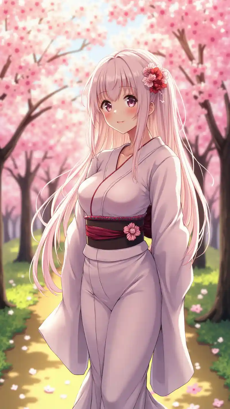Vertical large-scale image of an Ultra HD anime girl, breathtakingly gorgeous and seductive, basking in the morning sun, standing in a cherry blossom orchard outdoors in full bloom, wearing a delicate kimono with a plunging neckline and a floral obi, her long hair adorned with blossoms and a radiant smile, large shimmering eyes, glowing skin, soft pink and white color palette, refined features, perfect makeup, serene and romantic vibes, soft glow and natural lighting, emphasizing her alluring, well-defined chest with a subtle cleavage, and long, toned legs with a graceful stance, exuding beauty and charm.