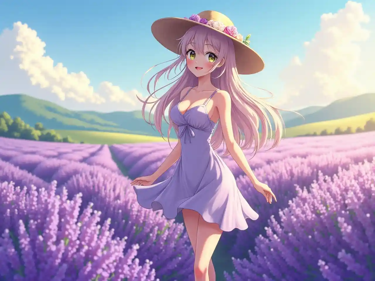 Horizontal large-scale image of an Ultra HD anime girl, breathtakingly gorgeous and seductive, basking in the morning sun, standing in a lavender field outdoors with rolling hills, wearing a summery dress with a plunging neckline and a wide-brim hat, her long hair adorned with flowers and a radiant smile, wide shimmering eyes, glowing skin, soft purple and green color palette, refined features, perfect makeup, serene and romantic vibes, soft glow and natural lighting, highlighting her voluptuous, well-defined chest with a subtle cleavage, and long, toned legs with a graceful stance, exuding beauty and charm.