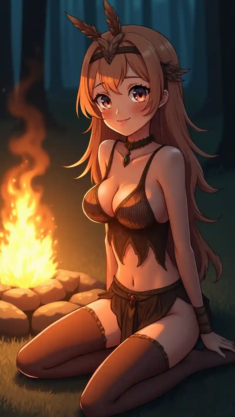 Vertical large-scale image of an Ultra HD anime girl, enchantingly beautiful and provocative, basking in the glow of a campfire, sitting in a forest clearing outdoors at night, wearing a tribal-inspired outfit with a deep neckline and thigh-high stockings, her long hair adorned with feathers and a sultry smile, big shimmering eyes, glowing skin, warm orange and brown color palette, soft features, bold makeup, wild and mystical vibes, warm lighting with a soft glow, accentuating her enticing, well-defined chest with a subtle cleavage, and long, toned legs with a relaxed pose, radiating allure and strength.