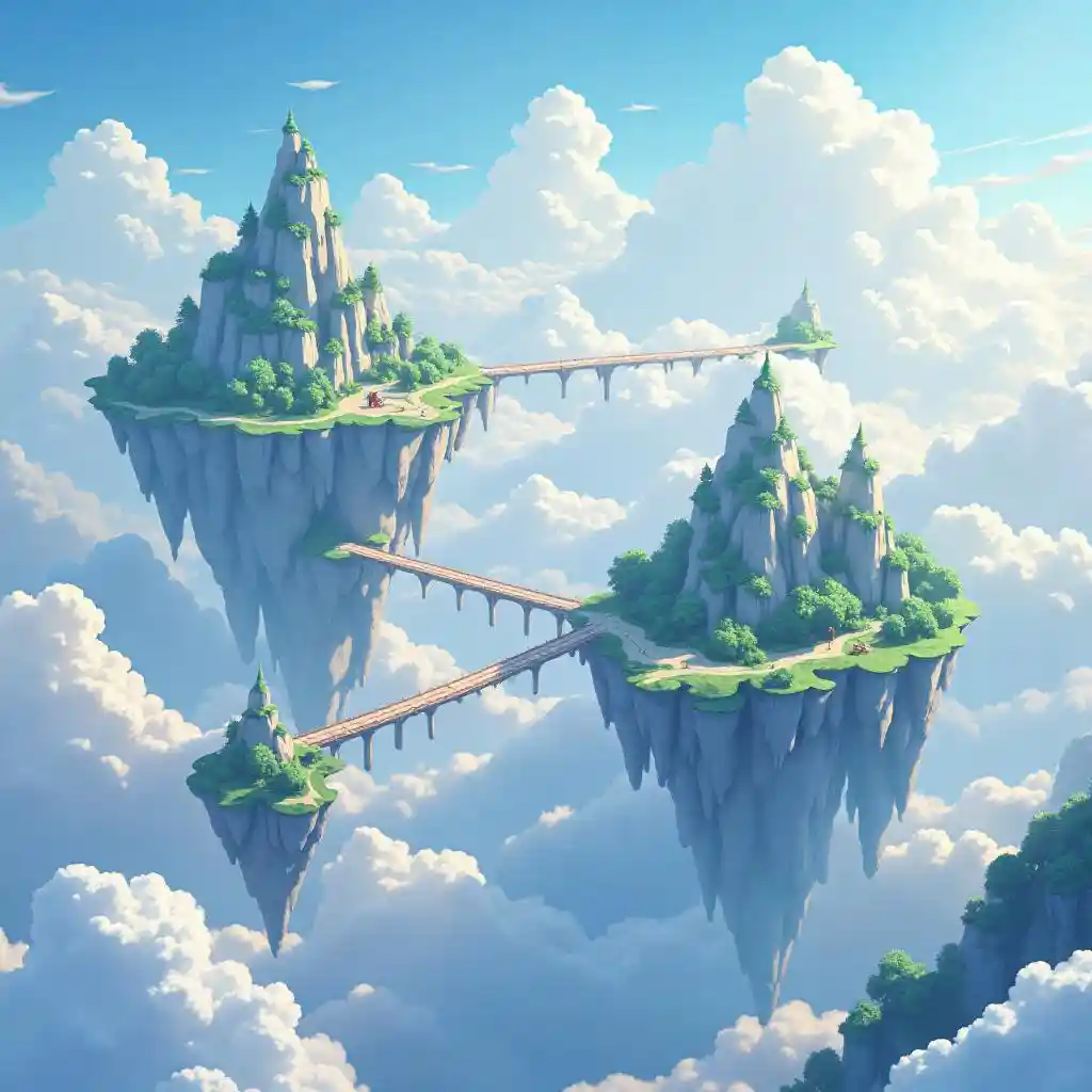 Ethereal realm with floating islands, bridges connecting clouds, mirroring dreamy anime visuals.