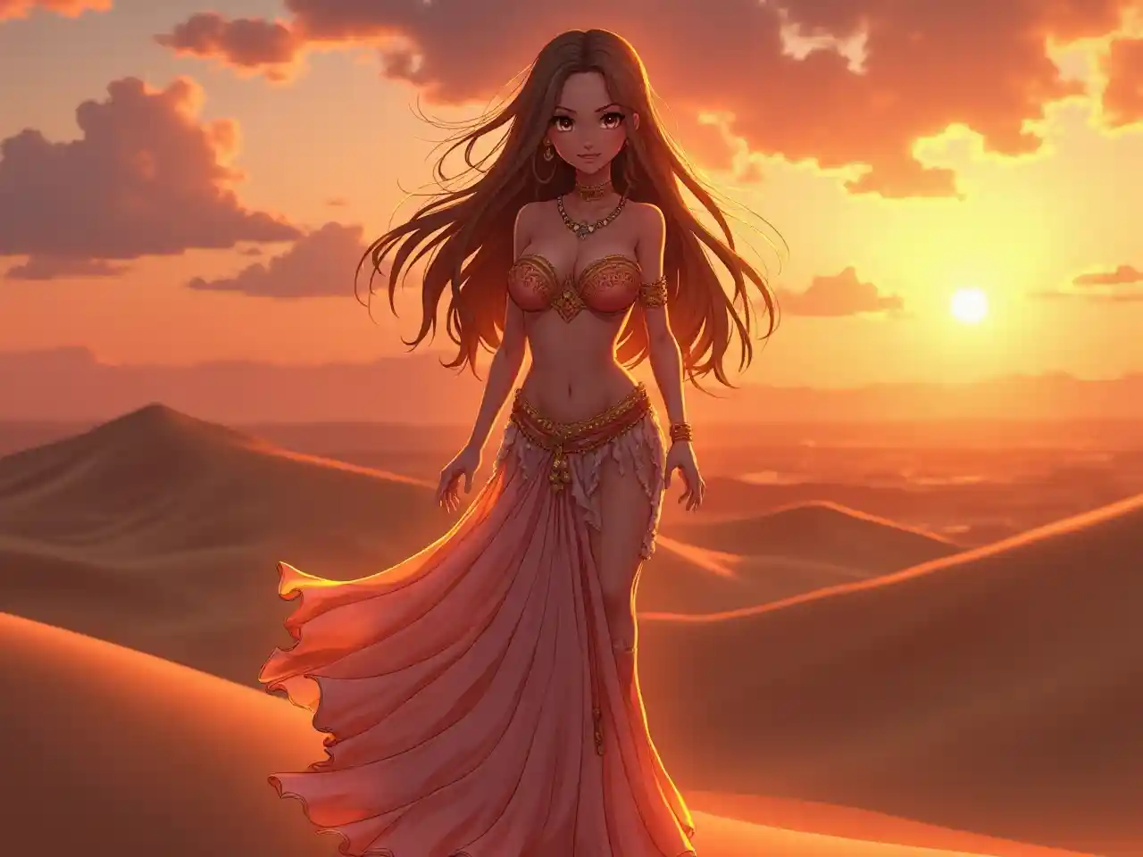 Horizontal large-scale image of an Ultra HD anime girl, radiantly beautiful and sensual, glowing in the twilight, standing on a desert dune outdoors with a colorful sunset, wearing a flowing belly dancer outfit with a deep neckline and sheer veil, her long hair dancing in the wind and a warm smile, big shimmering eyes, glowing skin, warm gold and orange color palette, elegant features, perfect makeup, exotic and adventurous vibes, soft glow and natural lighting, emphasizing her alluring, well-defined chest with a subtle cleavage, and long, toned legs with a graceful posture, radiating beauty and mystique.