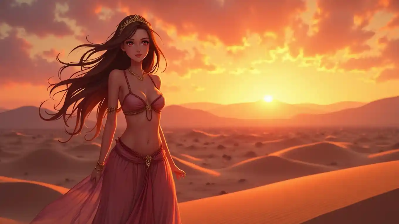 Horizontal large-scale image of an Ultra HD anime girl, enchantingly beautiful and adventurous, glowing in the twilight, standing on a desert dune outdoors with a colorful sunset, wearing a flowing belly dancer outfit with a deep neckline and sheer veil, her long hair dancing in the wind and a warm smile, big shimmering eyes, glowing skin, warm gold and orange color palette, soft features, perfect makeup, exotic and adventurous vibes, soft glow and natural lighting, accentuating her charming, well-defined chest with a subtle cleavage, and long, toned legs with a graceful posture, radiating beauty and mystique.