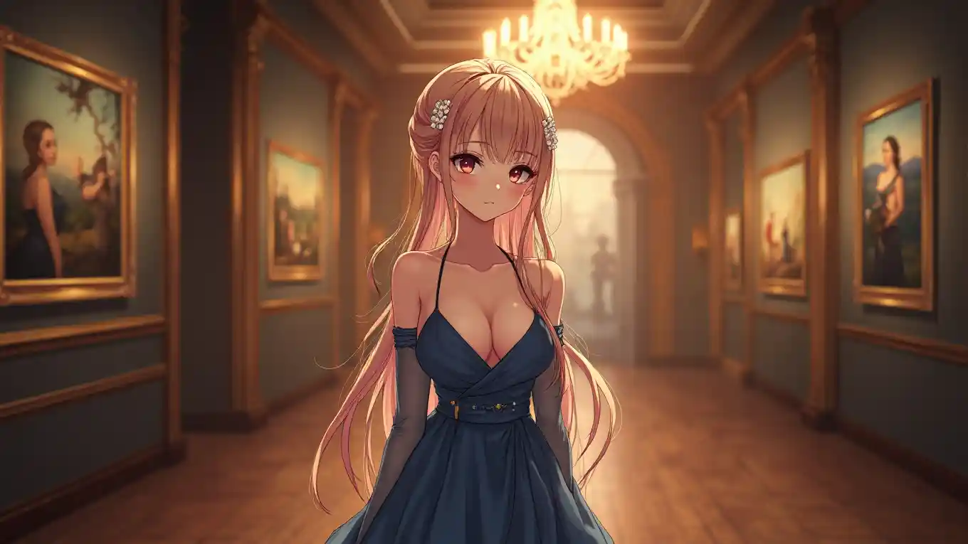Ultra HD Anime Girl in Luxurious Gown at Art Gallery