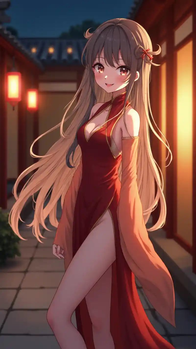 Vertical large-scale image of an Ultra HD anime girl, enchantingly gorgeous and elegant, illuminated by a lantern’s glow, standing in an indoor traditional Chinese courtyard at night, wearing a revealing hanfu with a deep neckline and sheer sleeves, her long hair adorned with a hair stick and a warm smile, big shimmering eyes, glowing skin, soft red and gold color palette, soft features, flawless makeup, tranquil and romantic vibes, warm lighting with a soft glow, accentuating her charming, well-defined chest with a subtle cleavage, and long, toned legs with a poised posture, radiating charm and elegance.