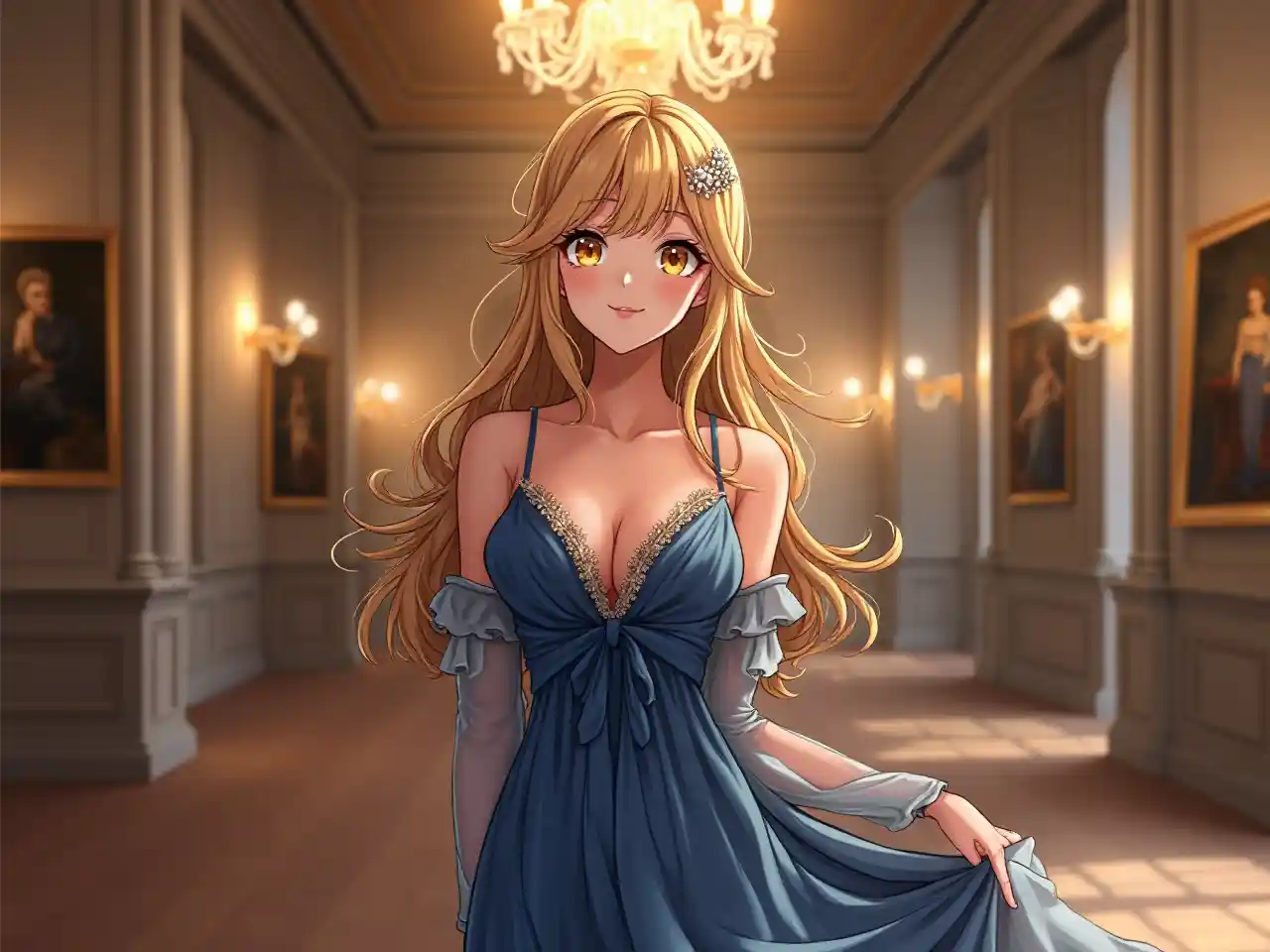 Horizontal large-scale image of an Ultra HD anime girl, radiantly stunning and elegant, illuminated by a chandelier’s light, standing in an indoor art gallery with classical paintings, wearing a luxurious evening gown with a plunging neckline and sheer sleeves, her long hair adorned with a pearl hairpin and a gentle smile, wide sparkling eyes, glowing skin, deep gold and blue color palette, delicate features, flawless makeup, sophisticated and artistic vibes, warm lighting with a soft glow, emphasizing her graceful, well-defined chest with a subtle cleavage, and long, toned legs with a poised posture, exuding charm and elegance.