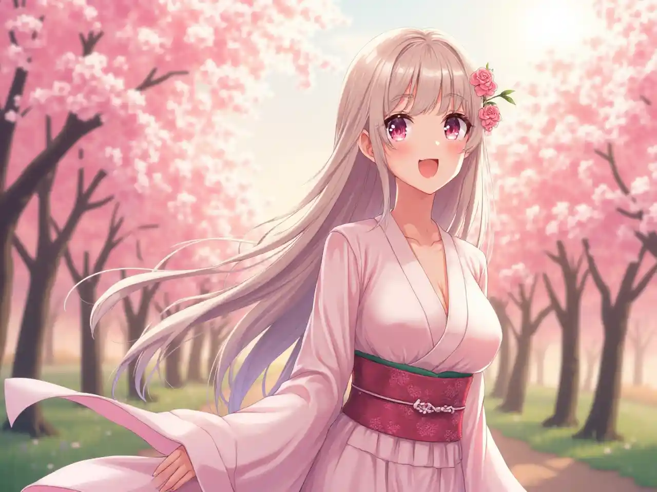 Horizontal large-scale image of an Ultra HD anime girl, breathtakingly gorgeous and serene, basking in the morning sun, standing in a cherry blossom orchard outdoors in full bloom, wearing a delicate kimono with a plunging neckline and a floral obi, her long hair adorned with blossoms and a radiant smile, wide sparkling eyes, glowing skin, soft pink and white color palette, refined features, perfect makeup, serene and romantic vibes, soft glow and natural lighting, emphasizing her graceful, well-defined chest with a subtle cleavage, and long, toned legs with a graceful stance, exuding beauty and charm.