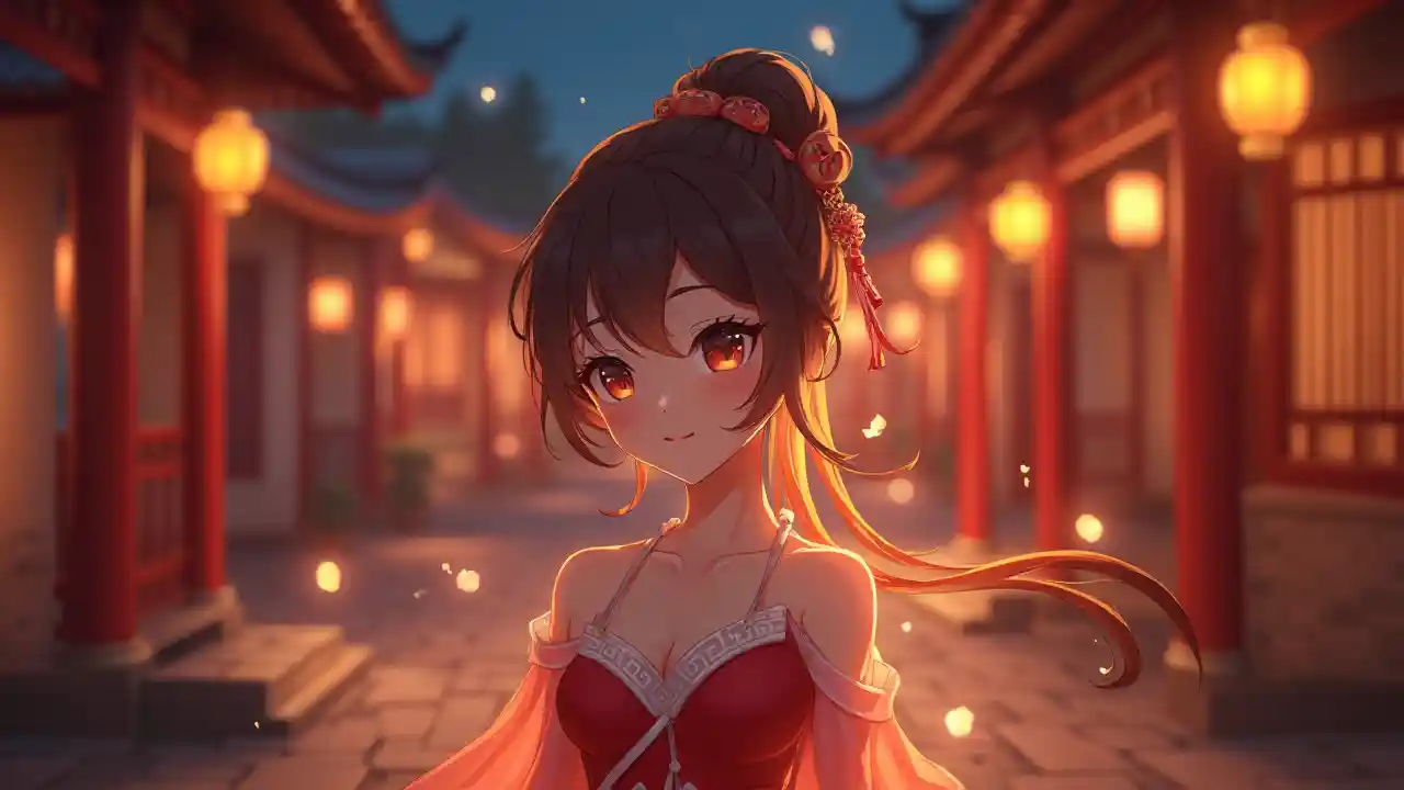 Horizontal large-scale image of an Ultra HD anime girl, radiantly beautiful and sensual, illuminated by a lantern’s glow, standing in an indoor traditional Chinese courtyard at night, wearing a revealing hanfu with a deep neckline and sheer sleeves, her long hair adorned with a hair stick and a warm smile, big sparkling eyes, glowing skin, soft red and gold color palette, elegant features, perfect makeup, tranquil and romantic vibes, warm lighting with a soft glow, emphasizing her alluring, well-defined chest with a subtle cleavage, and long, toned legs with a poised posture, radiating charm and elegance.