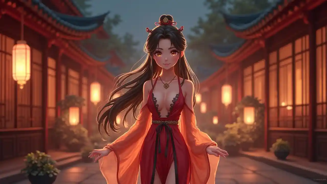 Horizontal large-scale image of an Ultra HD anime girl, strikingly beautiful and elegant, illuminated by a lantern’s glow, standing in an indoor traditional Chinese courtyard at night, wearing a revealing hanfu with a deep neckline and sheer sleeves, her long hair adorned with a hair stick and a warm smile, big shimmering eyes, glowing skin, soft red and gold color palette, sharp features, flawless makeup, tranquil and romantic vibes, warm lighting with a soft glow, highlighting her captivating, well-defined chest with a subtle cleavage, and long, toned legs with a poised posture, radiating charm and elegance.