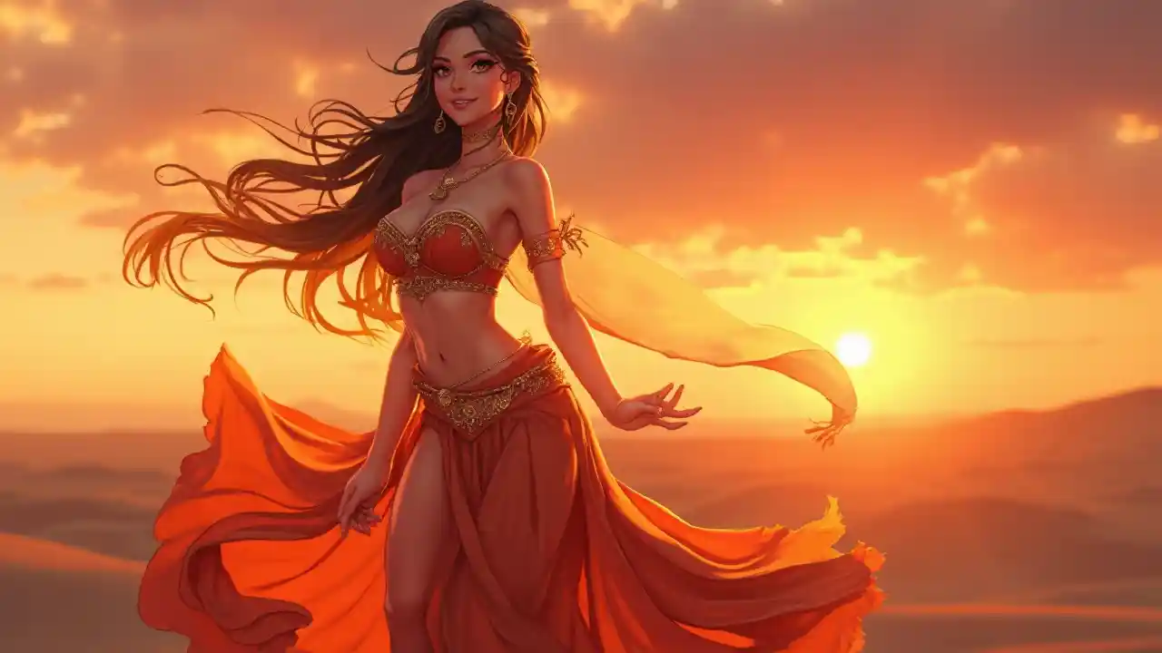 Horizontal large-scale image of an Ultra HD anime girl, radiantly stunning and adventurous, glowing in the twilight, standing on a desert dune outdoors with a colorful sunset, wearing a flowing belly dancer outfit with a deep neckline and sheer veil, her long hair dancing in the wind and a warm smile, big shimmering eyes, glowing skin, warm gold and orange color palette, elegant features, perfect makeup, exotic and adventurous vibes, soft glow and natural lighting, emphasizing her graceful, well-defined chest with a subtle cleavage, and long, toned legs with a graceful posture, radiating beauty and mystique.