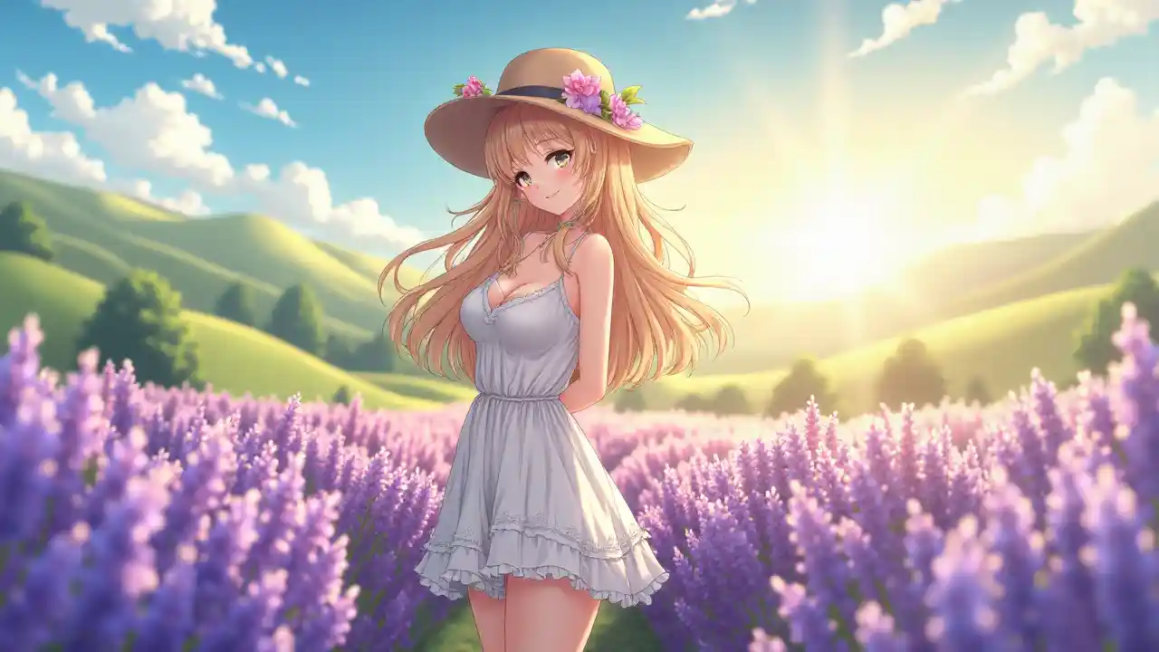 Horizontal large-scale image of an Ultra HD anime girl, breathtakingly gorgeous and seductive, basking in the morning sun, standing in a lavender field outdoors with rolling hills, wearing a summery dress with a plunging neckline and a wide-brim hat, her long hair adorned with flowers and a radiant smile, wide shimmering eyes, glowing skin, soft purple and green color palette, refined features, perfect makeup, serene and romantic vibes, soft glow and natural lighting, highlighting her voluptuous, well-defined chest with a subtle cleavage, and long, toned legs with a graceful stance, exuding beauty and charm.