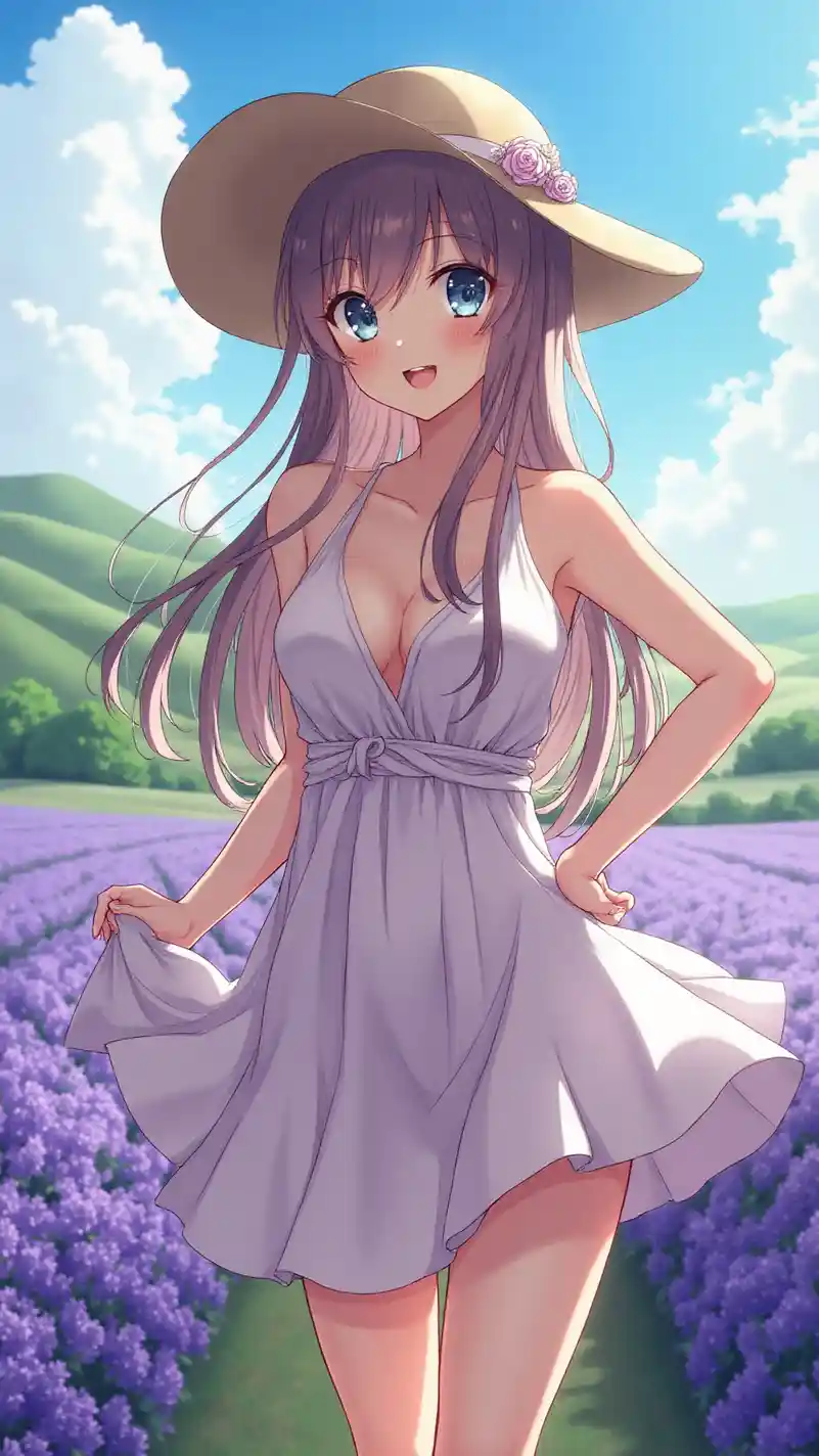 Vertical large-scale image of an Ultra HD anime girl, breathtakingly gorgeous and seductive, basking in the morning sun, standing in a lavender field outdoors with rolling hills, wearing a summery dress with a plunging neckline and a wide-brim hat, her long hair adorned with flowers and a radiant smile, wide shimmering eyes, glowing skin, soft purple and green color palette, refined features, perfect makeup, serene and romantic vibes, soft glow and natural lighting, highlighting her voluptuous, well-defined chest with a subtle cleavage, and long, toned legs with a graceful stance, exuding beauty and charm.