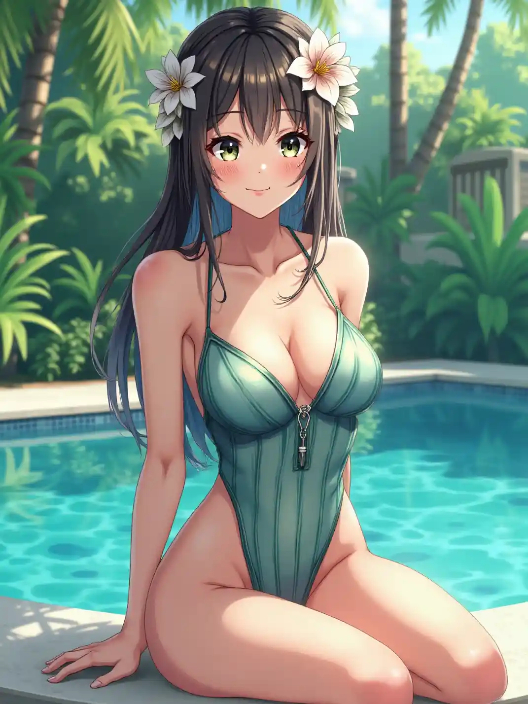 Vertical large-scale image of an Ultra HD anime girl, breathtakingly beautiful and confident, basking in the sunlight, lounging by an outdoor pool with tropical surroundings, wearing a metallic swimsuit with a plunging neckline and a floral hairpiece, her wet hair clinging to her skin and a confident smile, big shimmering eyes, glowing skin, vibrant blue and green color palette, refined features, perfect makeup, luxurious and refreshing vibes, soft glow and natural lighting, emphasizing her graceful, well-defined chest with a subtle cleavage, and long, toned legs with a relaxed pose, exuding beauty and confidence.