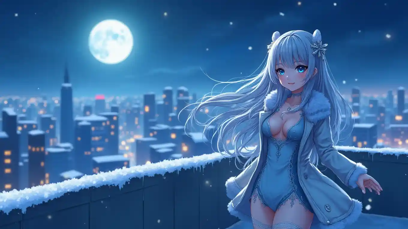 Horizontal large-scale image of an Ultra HD anime girl, breathtakingly gorgeous and magical, glowing under a full moon, standing on a snowy rooftop outdoors with city lights below, wearing a fur-trimmed coat over a tight dress with a plunging neckline and thigh-high stockings, her long hair shimmering with frost and a serene smile, wide sparkling eyes, glowing skin, icy blue and silver color palette, refined features, flawless makeup, magical and romantic vibes, soft glow and ambient lighting, emphasizing her graceful, well-defined chest with a subtle cleavage, and long, toned legs with a poised stance, radiating mystique and beauty.